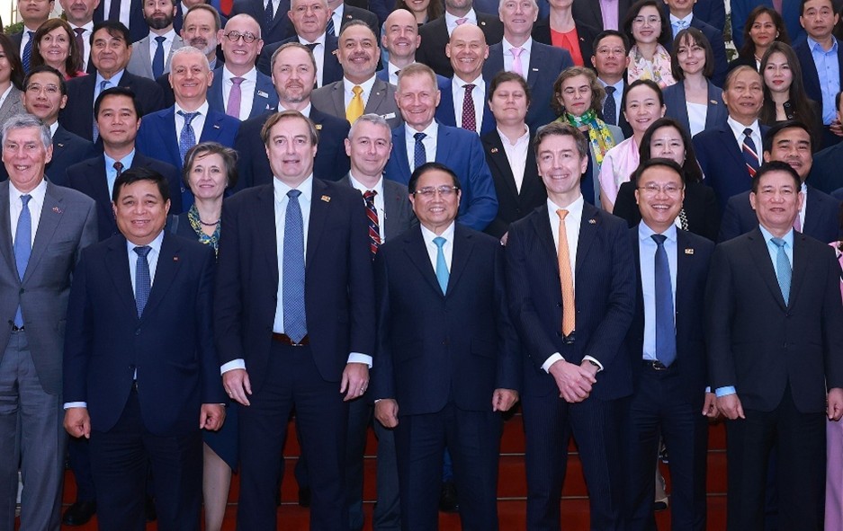2025年3月2日,越共中央政治局委员、政府总理范明正与欧洲企业代表 _图源:越通社